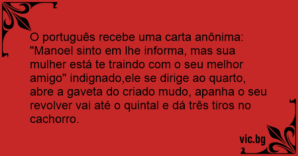 "Manoel sinto em lhe informa, mas sua mulher está te traindo com o seu melhor amigo" indignado,ele se dirige ao quarto, abre a gaveta do criado mudo, apanha o seu revolver vai até o quintal e dá três tiros no сасhоrrо.
