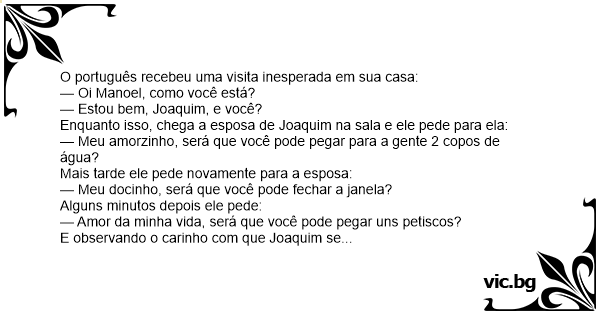 — Mas que coisa bonita, Joaquim, 35 anos de casado e ainda fala com todo esse carinho com a sua esposa. Qual o segredo?