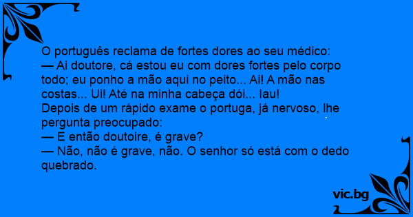O português foi ao médico reclamando de dores pelo corpo todo. — Ái doutor, onde eu aperto dói. Apontava uma parte do corpo, apertava e gemia. Braço, perna, pescoço, barriga, tudo doía. O doutor...