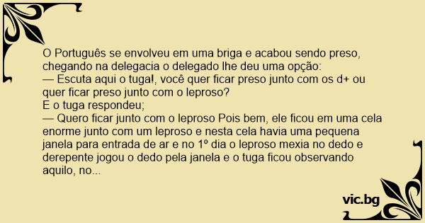 — Quero ficar junto com o leproso Pois bem, ele ficou em uma cela enorme junto com um leproso e nesta cela havia uma pequena janela para entrada de ar e no 1º dia o leproso mexia no dedo e derepente jogou o dedo pela janela e o tuga ficou observando aquilo, no 2º dia o leproso jogou o pé esquerdo pela janela, no 3º dia jogou o nariz, no 4º dia jogou uma perna, no 5º dia jogou uma mão até que o português não aguentou e chamou o carcereiro e disse;