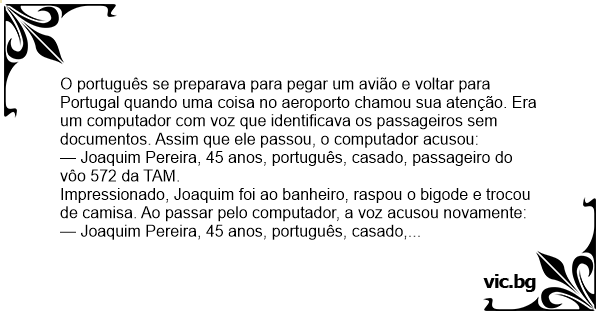 O português se preparava para pegar um avião e voltar para Portugal quando uma coisa no aeroporto chamou sua atenção. Era um computador com voz que identificava os passageiros sem documentos. Assim que ele passou, o computador acusou: