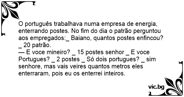 — E voce mineiro? _ 15 postes senhor _ E voce Portugues? _ 2 postes _ Só dois portugues? _ sim senhore, mas vais veires quantos metros eles enterraram, pois eu os enterrei inteiros.