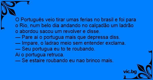 O Português veio tirar umas ferias no brasil e foi para o Rio, num belo dia andando no calçadão um ladrão o abordou sacou um revolver e disse.