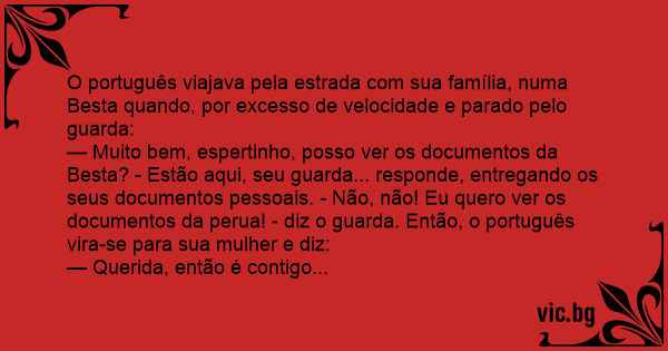 — Muito bem, espertinho, posso ver os documentos da Besta? - Estão aqui, seu guarda... responde, entregando os seus documentos pessoais. - Não, não! Eu quero ver os documentos da perua! - diz o guarda. Então, o português vira-se para sua mulher e diz: