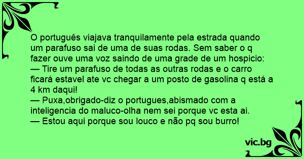 O português viajava tranquilamente pela estrada quando um parafuso sai de uma de suas rodas. Sem saber o q fazer ouve uma voz saindo de uma grade de um hospicio: