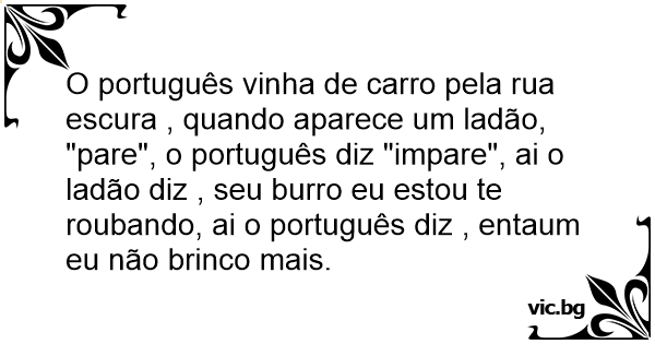 O português vinha de carro pela rua escura , quando aparece um ladão, "pare", o português diz "impare", ai o ladão diz , seu вurrо eu estou te roubando, ai o português diz , entaum eu não brinco mais.