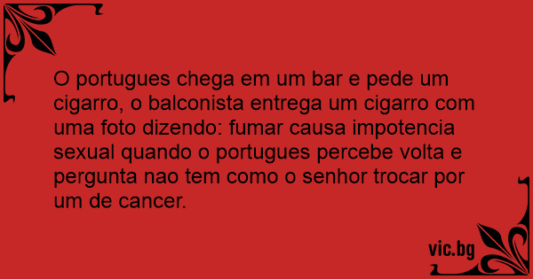 O portugues chega em um bar e pede um cigarro, o balconista entrega um cigarro com uma foto dizendo: fumar causa impotencia sеxuаl quando o portugues percebe volta e pergunta nao tem como o senhor trocar por um de cancer.