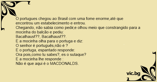 O portugues chegou ao Brasil com uma fome enorme,até que encontrou um estabelecimento e entrou.