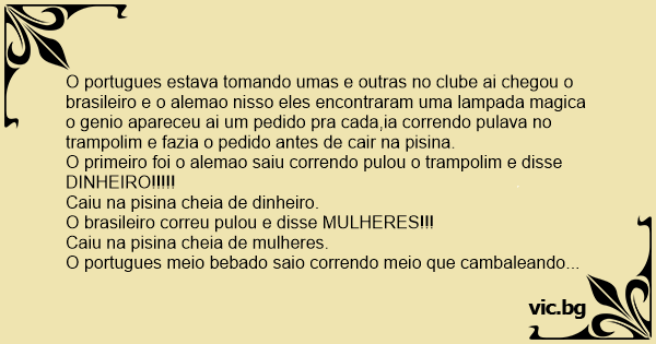 O portugues estava tomando umas e outras no clube ai chegou o brasileiro e o alemao nisso eles encontraram uma lampada magica o genio apareceu ai um pedido pra cada,ia correndo pulava no trampolim e fazia o pedido antes de cair na pisina.