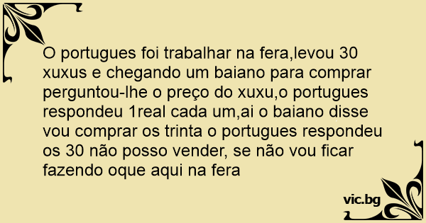 O portugues foi trabalhar na fera,levou 30 xuxus e chegando um baiano para comprar perguntou-lhe o preço do xuxu,o portugues respondeu 1real cada um,ai o baiano disse vou comprar os trinta o portugues respondeu os 30 não posso vender, se não vou ficar fazendo oque aqui na fera