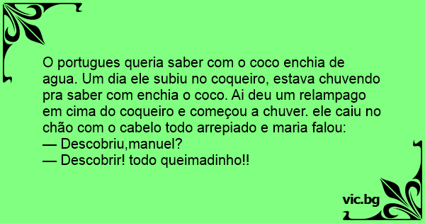 O portugues queria saber com o coco enchia de agua. Um dia ele subiu no coqueiro, estava chuvendo pra saber com enchia o coco. Ai deu um relampago em cima do coqueiro e começou a chuver. ele caiu no chão com o cabelo todo arrepiado e maria falou: