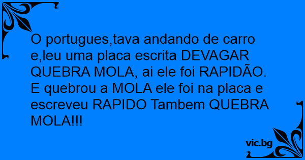 O portugues,tava andando de carro e,leu uma placa escrita DEVAGAR QUEBRA MOLA, ai ele foi RAPIDÃO. E quebrou a MOLA ele foi na placa e escreveu RAPIDO Tambem QUEBRA MOLA!!!