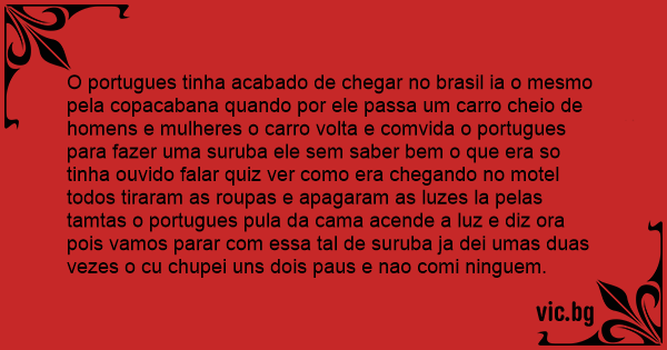O portugues tinha acabado de chegar no brasil ia o mesmo pela copacabana quando por ele passa um carro cheio de homens e mulheres o carro volta e comvida o portugues para fazer uma suruba ele sem saber bem o que era so tinha ouvido falar quiz ver como era chegando no motel todos tiraram as roupas e apagaram as luzes la pelas tamtas o portugues pula da cama acende a luz e diz ora pois vamos parar com essa tal de suruba ja dei umas duas vezes o cu chupei uns dois paus e nao comi ninguem.