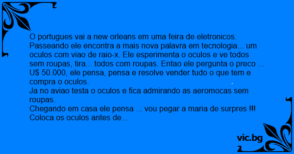 O portugues vai a new orleans em uma feira de eletronicos. Passeando ele encontra a mais nova palavra em tecnologia... um oculos com viao de raio-x. Ele esperimenta o oculos e ve todos sem roupas, tira... todos com roupas. Entao ele pergunta o preco ... U$ 50.000, ele pensa, pensa e resolve vender tudo o que tem e compra o oculos.