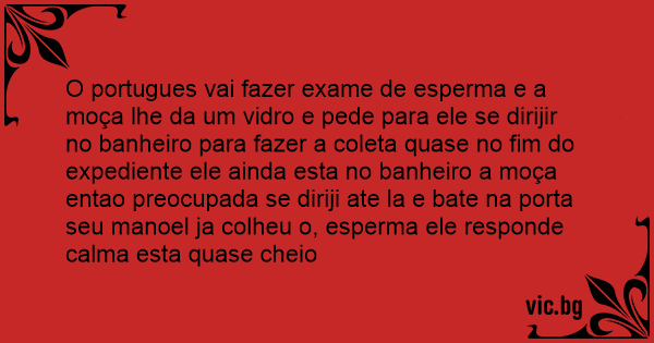 O portugues vai fazer exame de esperma e a moça lhe da um vidro e pede para ele se dirijir no banheiro para fazer a coleta quase no fim do expediente ele ainda esta no banheiro a moça entao preocupada se diriji ate la e bate na porta seu manoel ja colheu o, esperma ele responde calma esta quase cheio