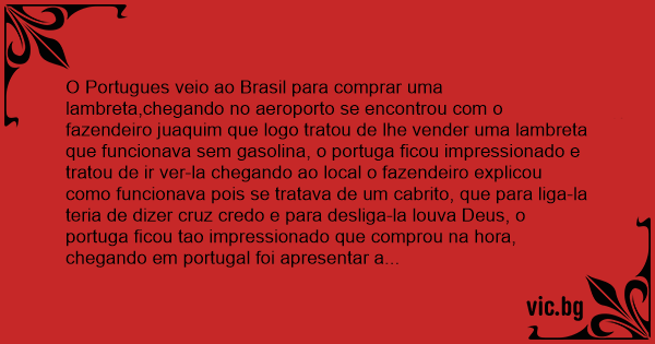 O Portugues veio ao Brasil para comprar uma lambreta,chegando no aeroporto se encontrou com o fazendeiro juaquim que logo tratou de lhe vender uma lambreta que funcionava sem gasolina, o portuga ficou impressionado e tratou de ir ver-la chegando ao local o fazendeiro explicou como funcionava pois se tratava de um cabrito, que para liga-la teria de dizer cruz credo e para desliga-la louva Deus, o portuga ficou tao impressionado que comprou na hоrа, chegando em portugal foi apresentar a novidade na cidade,so que ele se esqueceu da palavra para desligar, e só gritava, cruz credo, cruz credo, e ja estava chegando proximo ao precipicio e nao achava os freios, foi em tao que ele resouveu passar a mao atraz do bode, ai ele achou uma coiza meio mole puchou e apertou quando ele fez isso o bode parou e berrou beeeeeeeeeeee ai o portuga disse huuu Diabo emcontrei o freio e o Apito.