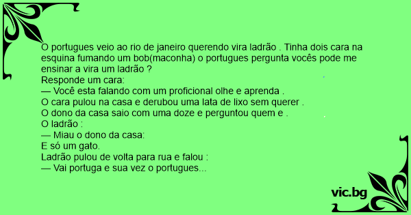 O portugues veio ao rio de janeiro querendo vira ladrão . Tinha dois cara na esquina fumando um bob(maconha) o portugues pergunta vocês pode me ensinar a vira um ladrão ?