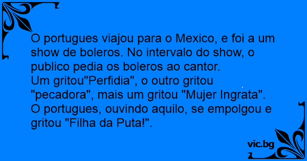 O portugues viajou para o Mexico, e foi a um show de boleros. No intervalo do show, o publico pedia os boleros ao cantor.