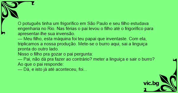— Meu filho, esta máquina foi teu papai que inventaste. Com ela, triplicamos a nossa produção. Mete-se o вurrо aqui, sai a linguiça pronta do outro lado.