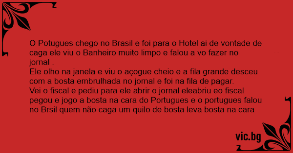 O Potugues chego no Brasil e foi para o Hotel ai de vontade de caga ele viu o Banheiro muito limpo e falou a vo fazer no jornal .