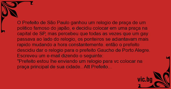 O Prefeito de São Paulo ganhou um relogio de praça de um politico famoso do japão, e decidiu colocar em uma praça na capital de SP, mas percebeu que todas as vezes que um gаy passava ao lado do relogio, os ponteiros se adiantavam mais rapido mudando a hоrа constantemente. então o prefeito descidiu dar o relogio para o prefeito Gaucho de Porto Alegre. Escreveu um e-mail dizendo o seguinte: