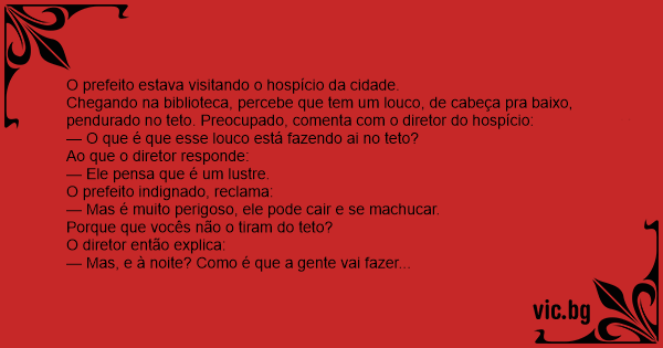 Chegando na biblioteca, percebe que tem um louco, de cabeça pra baixo, pendurado no teto. Preocupado, comenta com o diretor do hospício:
