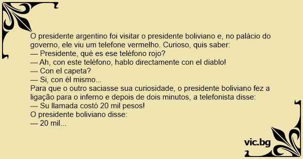 O presidente argentino foi visitar o presidente boliviano e, no palácio do governo, ele viu um telefone vermelho. Curioso, quis saber: