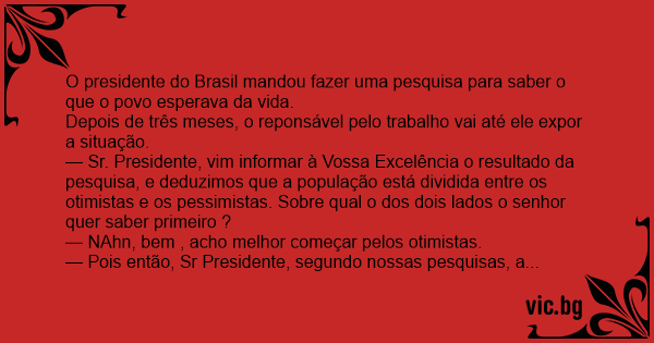 — Sr. Presidente, vim informar à Vossa Excelência o resultado da pesquisa, e deduzimos que a população está dividida entre os otimistas e os pessimistas. Sobre qual o dos dois lados o senhor quer saber primeiro ?