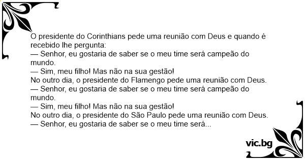O presidente do Corinthians pede uma reunião com Deus e quando é recebido lhe pergunta: