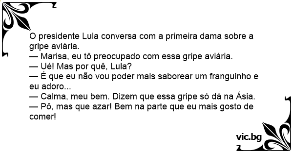 — Marisa, eu tô preocupado com essa gripe aviária.