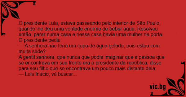 O presidente Lula, estava passeando pelo interior de São Paulo, quando lhe deu uma vontade enorme de beber água. Resolveu então, parar numa casa e nessa casa havia uma mulher na porta. O presidente pediu: