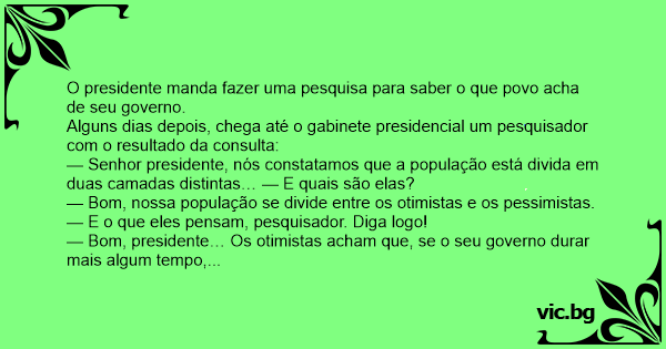 — Bom, presidente… Os otimistas acham que, se o seu governo durar mais algum tempo, todo mundo vai acabar comendo меrdа… — Nossa, esses são os otimistas? Me diga então o que pensam os pessimistas!
