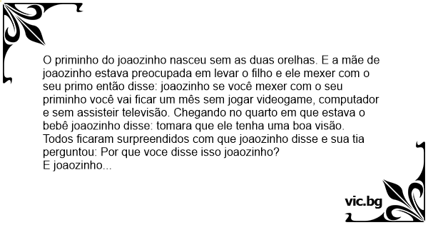 O priminho do joaozinho nasceu sem as duas orelhas. E a mãe de joaozinho estava preocupada em levar o filho e ele mexer com o seu primo então disse: joaozinho se você mexer com o seu priminho você vai ficar um mês sem jogar videogame, computador e sem assisteir televisão. Chegando no quarto em que estava o bebê joaozinho disse: tomara que ele tenha uma boa visão.