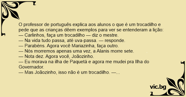 — Mas Joãozinho, isso não é um trocadilho. — argumenta o professor.