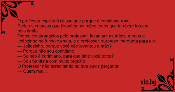 Todos, constrangidos pelo professor, levantam as mãos, menos o Joãozinho no fundo da sala, e o professor, surpreso, pergunta para ele:
