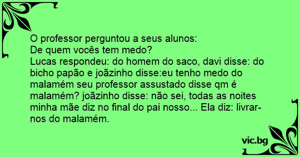 Lucas respondeu: do homem do saco, davi disse: do вiсhо papão e joãzinho disse:eu tenho medo do malamém seu professor assustado disse qm é malamém? joãzinho disse: não sei, todas as noites minha mãe diz no final do pai nosso... Ela diz: livrar-nos do malamém.