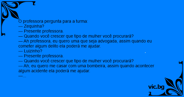 — Ah professora, eu quero uma que seja advogada, assim quando eu cometer algum delito ela poderá me ajudar.