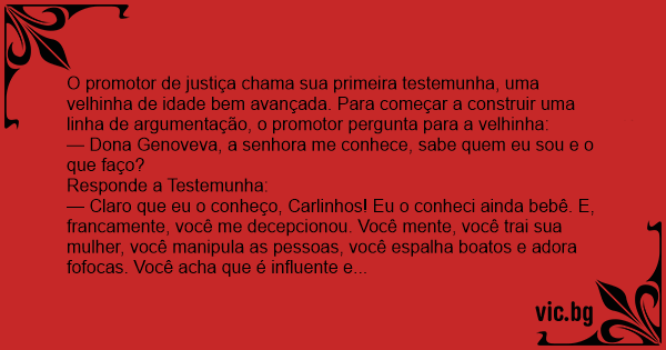 O promotor de justiça chama sua primeira testemunha, uma velhinha de idade bem avançada. Para começar a construir uma linha de argumentação, o promotor pergunta para a velhinha: