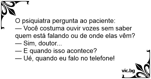 Um homem procura um psiquiatra, chegando lá ele explica ao doutor o seu problema: — Eu escuto vozes que não sei de onde vem... — E quando isso acontece? — pergunta o doutor. — Quando eu atendo o telefone.