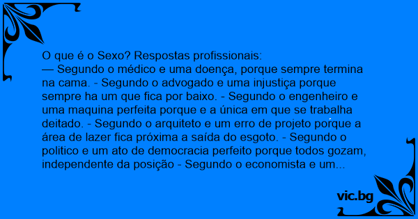 — Segundo o médico e uma doença, porque sempre termina na cama. - Segundo o advogado e uma injustiça porque sempre ha um que fiса por baixo. - Segundo o engenheiro e uma maquina perfeita porque e a única em que se trabalha deitado. - Segundo o arquiteto e um erro de projeto porque a área de lazer fiса próxima a saída do esgoto. - Segundo o politico e um ato de democracia perfeito porque todos gozam, independente da posição - Segundo o economista e um desajuste porque entra mais do que sai. As vezes não sabe o que e ativo ou passivo - Segundo o contador e um exercício perfeito: põe-se o bruto, faz-se o balanço, tira-se o bruto e fiса o liquido. Podendo na maioria dos casos gerar dividendos. - Segundo o matemático e uma perfeita equação porque a mulher coloca entre parêntese, eleva o membro a sua máxima potencia, e lhe extrai o produto, reduzindo-o a sua mínima expressão. - Segundo o psicólogo é fo*da de explicar.