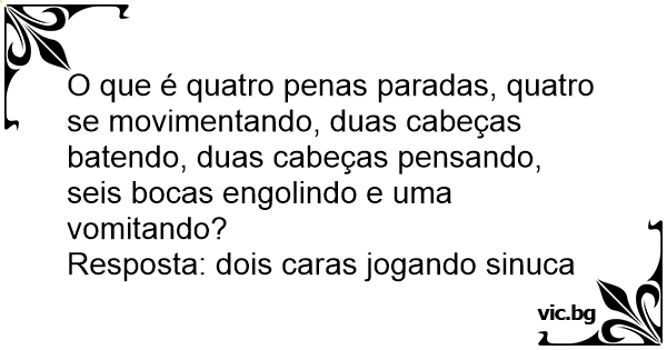 O que é quatro penas paradas, quatro se movimentando, duas cabeças batendo, duas cabeças pensando, seis bocas engolindo e uma vomitando?