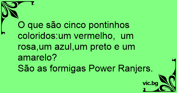 O que são cinco pontinhos coloridos:um vermelho, um rosa,um azul,um preto e um amarelo?<br />São as formigas Power Ranjers.