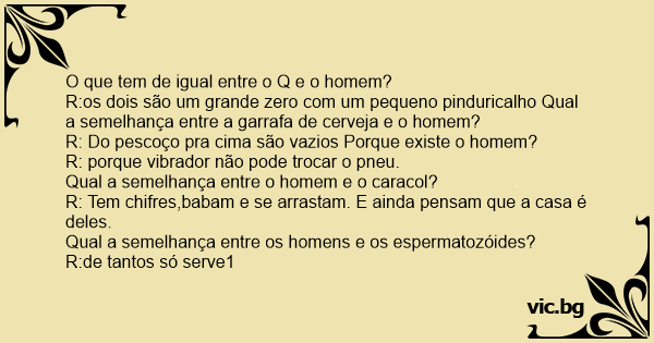 R:os dois são um grande zero com um pequeno pinduricalho Qual a semelhança entre a garrafa de cerveja e o homem?