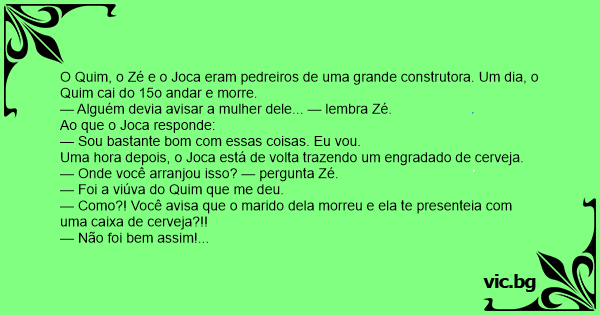 — Não foi bem assim! Quando ela abriu a porta, eu disse: *Você deve ser a viúva do Quiм*. Ela respondeu: *Não, eu não sou viúva*. E eu disse: *Quer apostar um engradado de cerveja?*