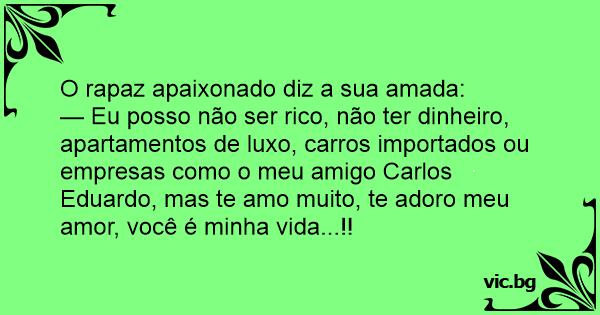 — Eu posso não ser rico, não ter dinheiro, apartamentos de luxo, carros importados ou empresas como o meu amigo Carlos Eduardo, mas te amo muito, te adoro meu amor, você é minha vida...!!