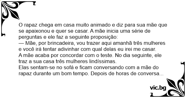 — Mãe, por brincadeira, vou trazer aqui amanhã três mulheres e você irá tentar adivinhar com qual delas eu irei me casar.