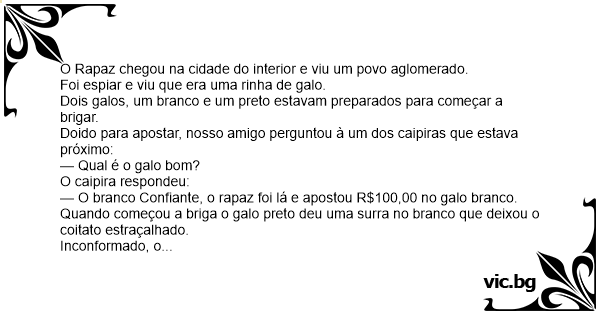 — O branco Confiante, o rapaz foi lá e apostou R$100,00 no galo branco.