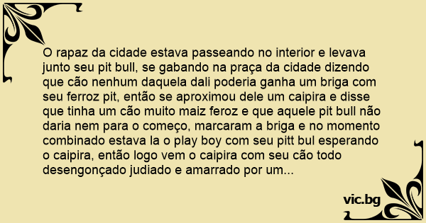 O rapaz da cidade estava passeando no interior e levava junto seu pit bull, se gabando na praça da cidade dizendo que cão nenhum daquela dali poderia ganha um briga com seu ferroz pit, então se aproximou dele um caipira e disse que tinha um cão muito maiz feroz e que aquele pit bull não daria nem para o começo, marcaram a briga e no momento combinado estava la o play boy com seu pitt bul esperando o caipira, então logo vem o caipira com seu cão todo desengonçado judiado e amarrado por um pedaço de corda tamanho a pobreza, o play boy falou- caipira seu cão é grande mas não vai dar nem para o cheiro, não dando atenção o caipira insistiu na briga, então puseram os doi cães para brigar - a briga não durou nem 1 minuto e o play boy só ficou com a coleira do pitt bull na mão, o cão do caipira havia devorado seu pitt bull, era inacreditavel, então o play boy lhe perguntou- o caipira onde voce conseguiu este сасhоrrо, e o caipira responde: é que passou um circo pela cidade mês passado, eu fiz alguns serviços para eles e eles me deram este сасhоrrо, eu dei-lhe um banho e cortei seus cabelhos e ele ficou assim.