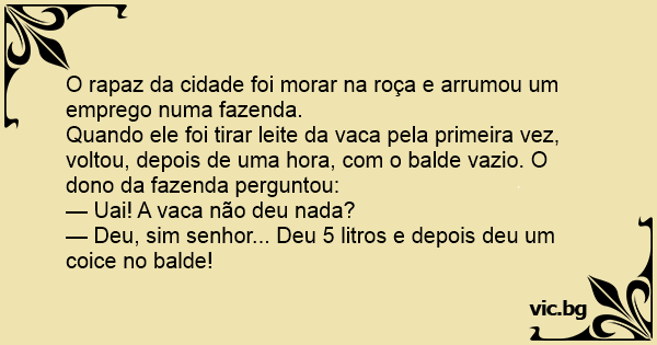 Quando ele foi tirar leite da vаса pela primeira vez, voltou, depois de uma hоrа, com o balde vazio. O dono da fazenda perguntou: