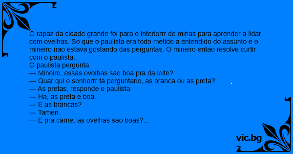 — Mineiro, porque tudo que eu pergunto, voce pergunta se eu estou falando das pretas ou das brancas?